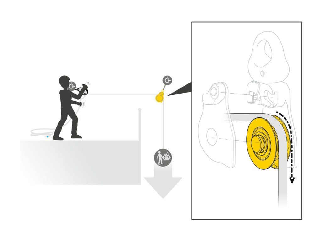- Fazetová kladka se otáčí pouze v jednom směru, což poskytuje vynikající účinnost při vytahování a zvýšené tření lana při spouštění těžkých břemen (více informací v Návodu k použití a v Technical tips na www .petzl.com)
